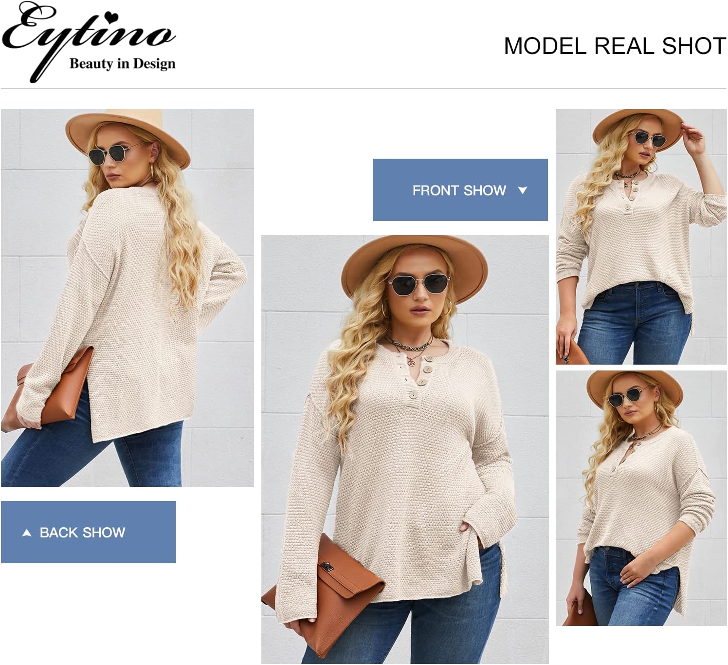 Womens Plus Size Sweaters Henley V Neck Jumpers Lighweight Pullover Tops
